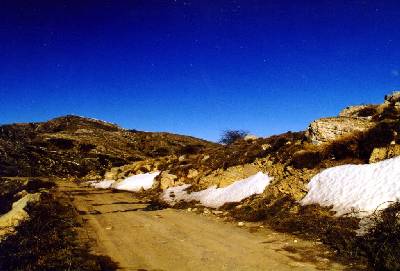 Salendo per la strada sterrata in mezzo a uliveti ci si porta tranquillamente sul crinale. Al primo bivio, 300 m dopo La Colla, si prende a sinistra, e gli uliveti cominciano a lasciare il posto alla macchia mediterranea; più avanti, ad un altro bivio, si prosegue sulla strada principale tralasciando quella a sinistra.