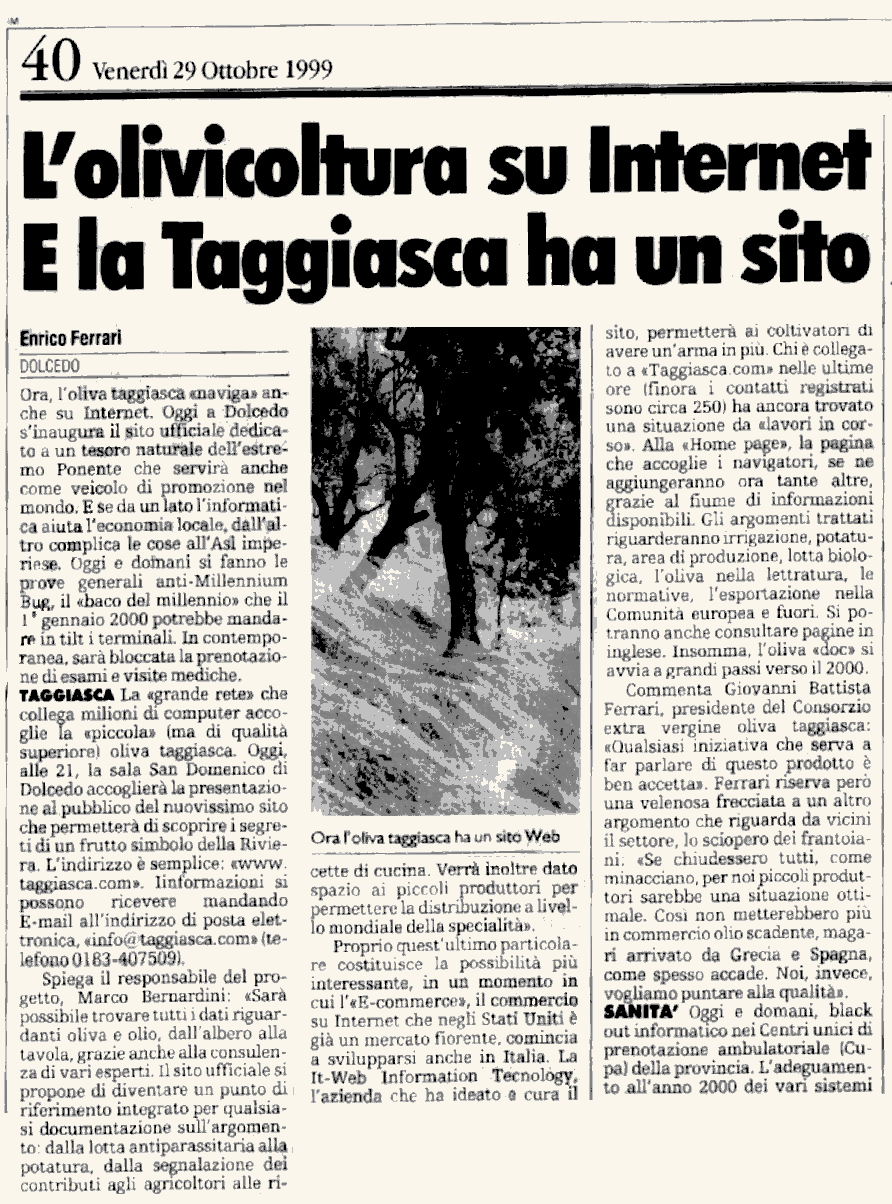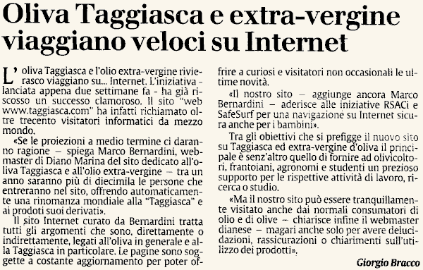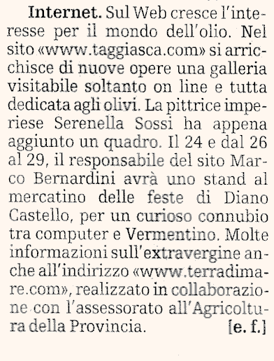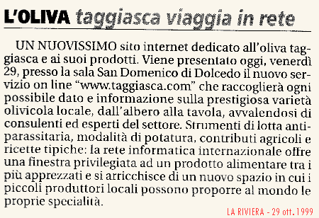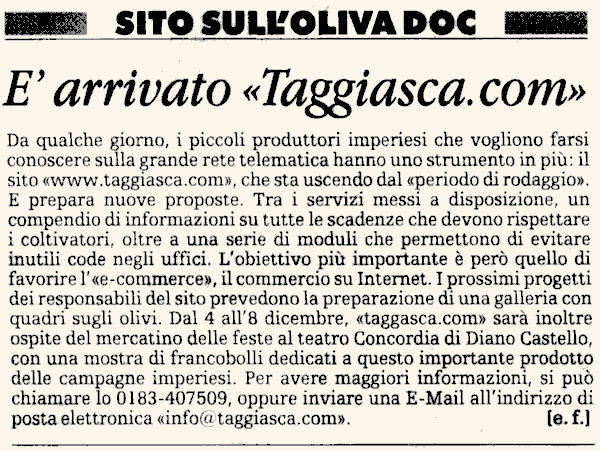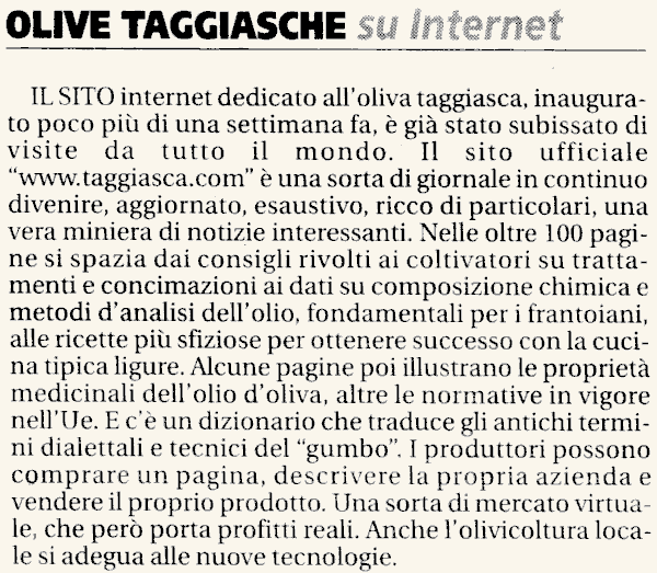 Ecco quello che nel 1999 hanno scritto di noi i giornali.Se qualcuno fosse a conoscenza di un articolo non riportato in queste pagine lo invitiamo a contattare il webmaster. Per i giornalisti è a disposizione il Press Kit di taggiasca.com, dove trovare tutte le documentazioni su questo sito. ![]() L'olivicoltura su Internet - E la Taggiasca ha un sito [Enrico Ferrari - La Stampa - 29/10/99] testo dell'articolo Immagine dell'articolo (125 kb - 892 × 1204 pixel) L'OLIVA taggiasca viaggia in rete [La Riviera - 29/10/99] testo dell'articolo Immagine dell'articolo (15 kb - 450 × 308 pixel) ![]() Oliva Taggiasca e extra-vergine viaggiano veloci su Internet [Giorgio Bracco - Il Secolo XIX - 18/11/99] testo dell'articolo Immagine dell'articolo (27 kb - 600 × 383 pixel) OLIVE TAGGIASCHE su Internet [La Riviera - 19/11/99] testo dell'articolo Immagine dell'articolo (30 kb - 600 × 523 pixel) ![]() E' arrivato <<Taggiasca.com>> [Enrico Ferrari - La Stampa - 27/11/99] testo dell'articolo Immagine dell'articolo (29 kb - 600 × 451 pixel) Internet-olio, binomio vincente [Enrico Ferrari - La Stampa - 22/12/99] testo dell'articolo Immagine dell'articolo (20 kb - 392 × 516 pixel) Agli articoli del 2000 copyright © 1999 - 2000 by It-Web Information Technology - all rights reserved |